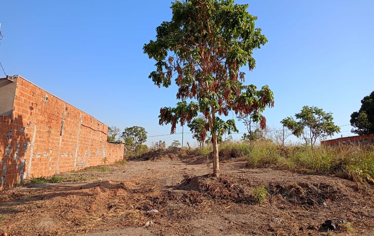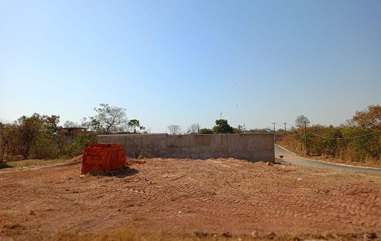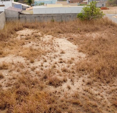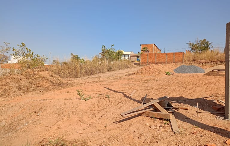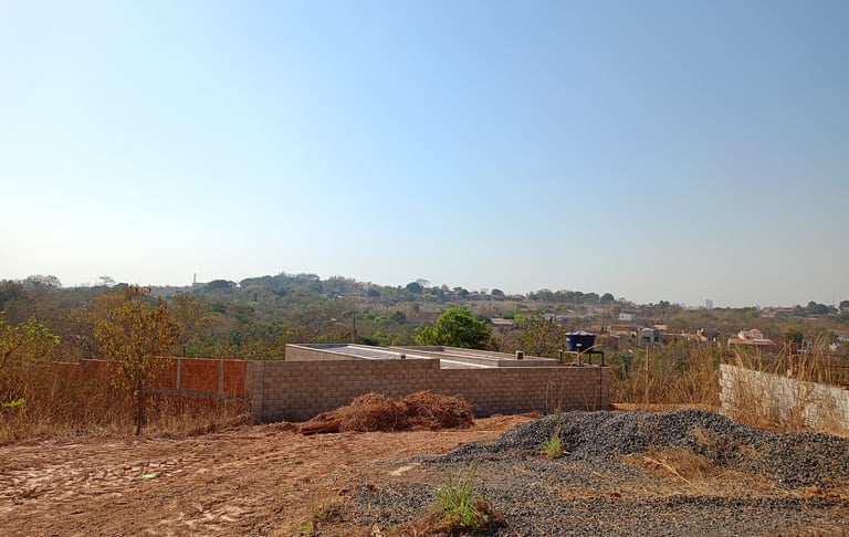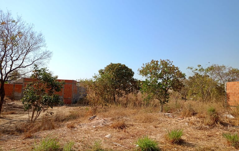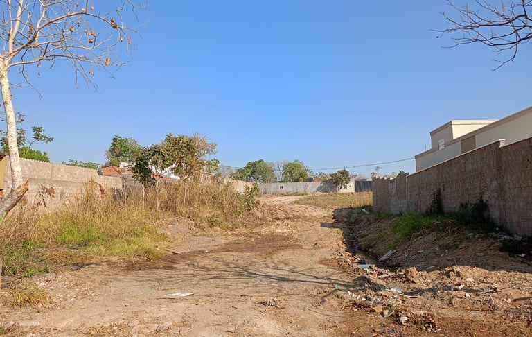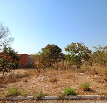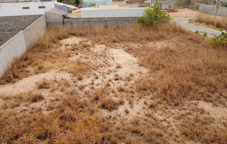 Lote em área urbana com amplo espaço aberto e vegetação esparsa.