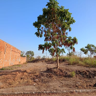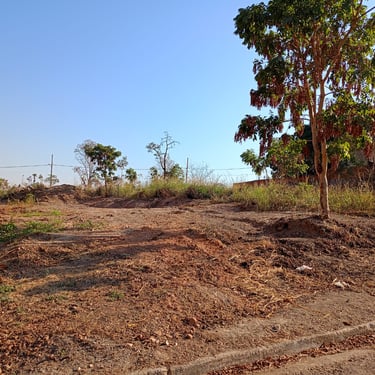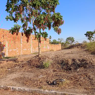 Lote em área urbana com amplo espaço aberto e vegetação esparsa.